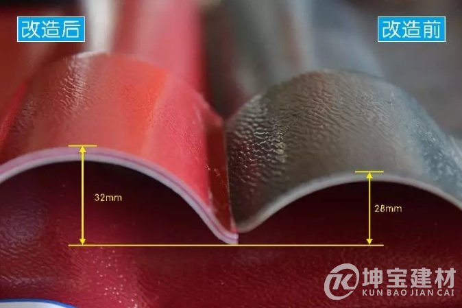 其中品牌全新一代坤寶品牌樹脂瓦的瓦波高由28mm增加到32mm,超過市場大部分樹脂瓦波高(主要是市場上28mm和30mm)。 不僅在外觀上,更立體,更直觀的沖擊,而且由于毫米4波高的增加,瓦之間搭接部分的泄漏危險大大降低,安全性更安全。
