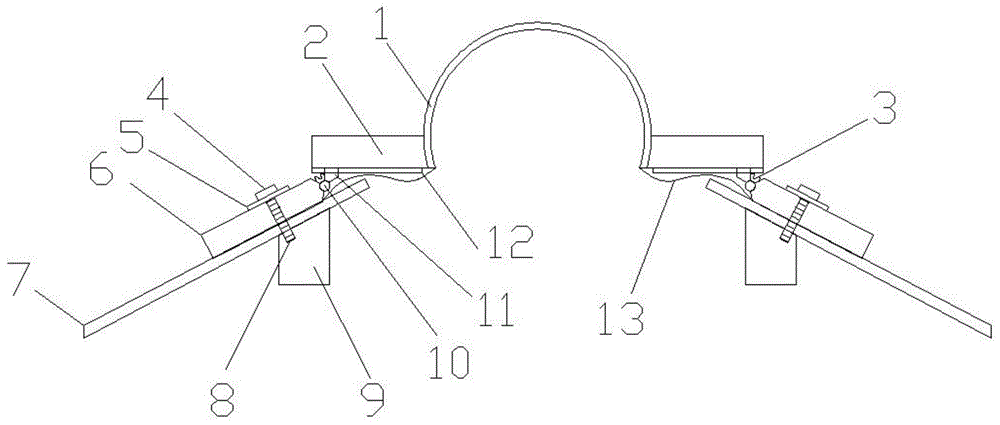 圖中:安裝座1,安裝塊2,彈簧3,螺栓頭4,防水墊5,連接塊6,瓦片7,螺紋桿8,安裝桿9,活頁10,滑塊11,滑軌12,防水膜13,螺紋孔14。