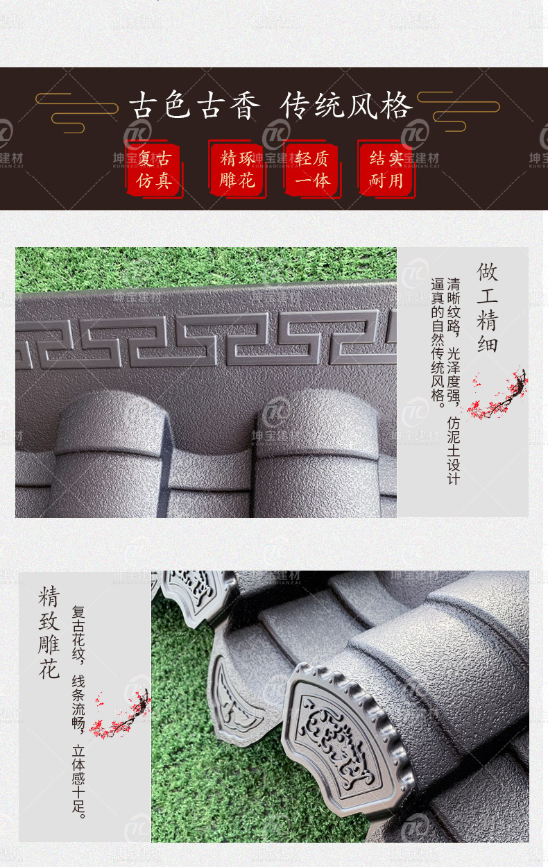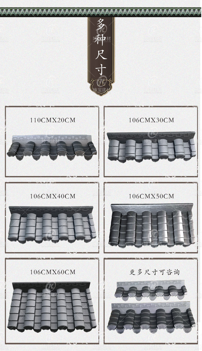 用途:徽派建筑裝飾(室內外皆可用)圍墻、門頭、徽派古建筑、徽派小瓦