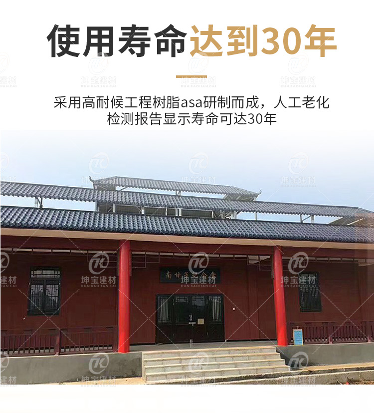 古建筑作為歷史的見證者,在時代的發展中存在著重要意義,為了讓這些文化長久的生存下來,既要進行合理的維護也要繼承和發揚。仿古合成樹脂瓦可以規避傳統青瓦、琉璃瓦等仿古瓦材易碎、易裂、容易掉落等問題;功能上防腐耐候、防火阻燃還可抵抗冰雹等襲擊瓦面不損壞,而且經雨水沖刷還自潔如新。