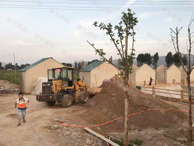 甘肅某綠色生態(tài)園農(nóng)莊第一期建設(shè)工程正式動(dòng)土開工,從坤寶建材專門定制生產(chǎn)的草綠色合成樹脂瓦也安裝了兩間樣板房,工人們正冒著高溫酷暑在工地上施工。 甘肅某生態(tài)園施工現(xiàn)場(chǎng) 修建生態(tài)園房屋所用的墻磚 坤寶牌草綠色樹脂瓦根據(jù)每間房屋的需求量被堆放在旁邊